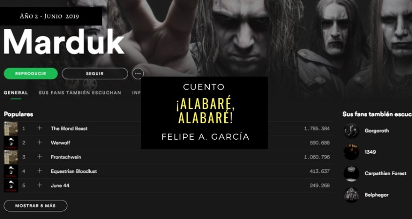 Al llegar a casa, tal como lo imaginó, estaba el pastor y sus feligreses gritando como locos sus cánticos. Aún sin las bocinas el ruido era desesperante, pero esa noche a Jorge no le importaba. Abrió el baúl del coche, sacó las bocinas nuevas y luego entró a su hogar. Él lo único que quería era escuchar a su banda favorita a todo volumen. Encendió su computadora. Abrió Spotify y buscó el playlist con todas sus canciones preferidas de Marduk. “Alabaré, alabaré, alabaré a mi señor…”, cantaban afuera. Conectó las bocinas a su computadora y subió el volumen al máximo. Y mientras afuera cantaban otra vez el coro de “Alabaré, alabaré, alabaré a mi señor…”, Jorge puso play a la música y pudo por fin escucharla a todo volumen.